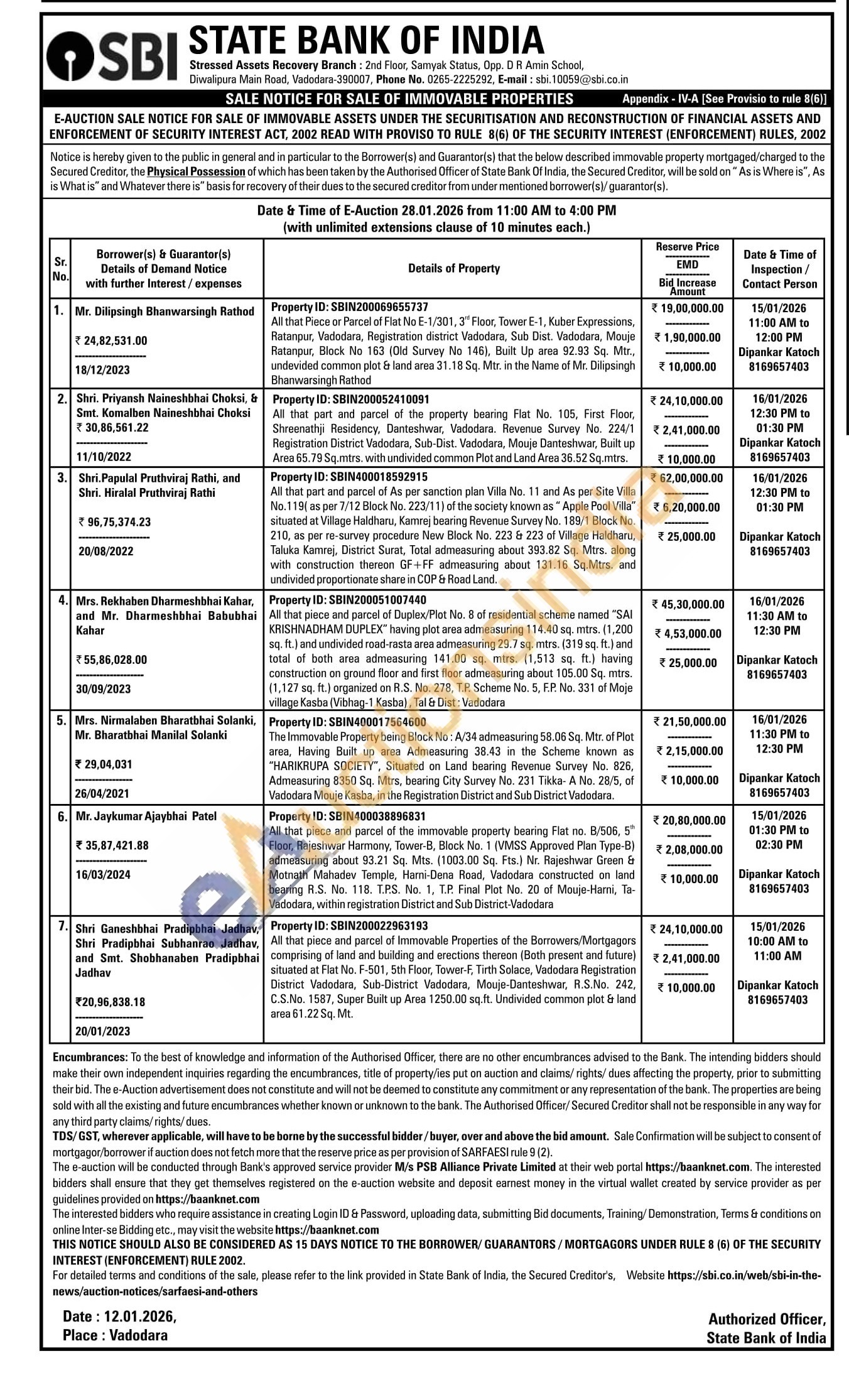 All that piece and parcel of Immovable Properties of the Borrowers/Mortgagers comprising of land and building and erections therson (Both present and future) situated at Flat No. F-501, 5th Floor, Tower F, Tirth Solace, Vadodara Registration District Vadodara, Sub-District Vadodara, Mouje-Danteshwar, R.S.No. 242 C.S.No. 1587, Super Built up Arsa 1250.00 sq.ft. Undivided common plot & land aron 61.22 Sq. Mt.