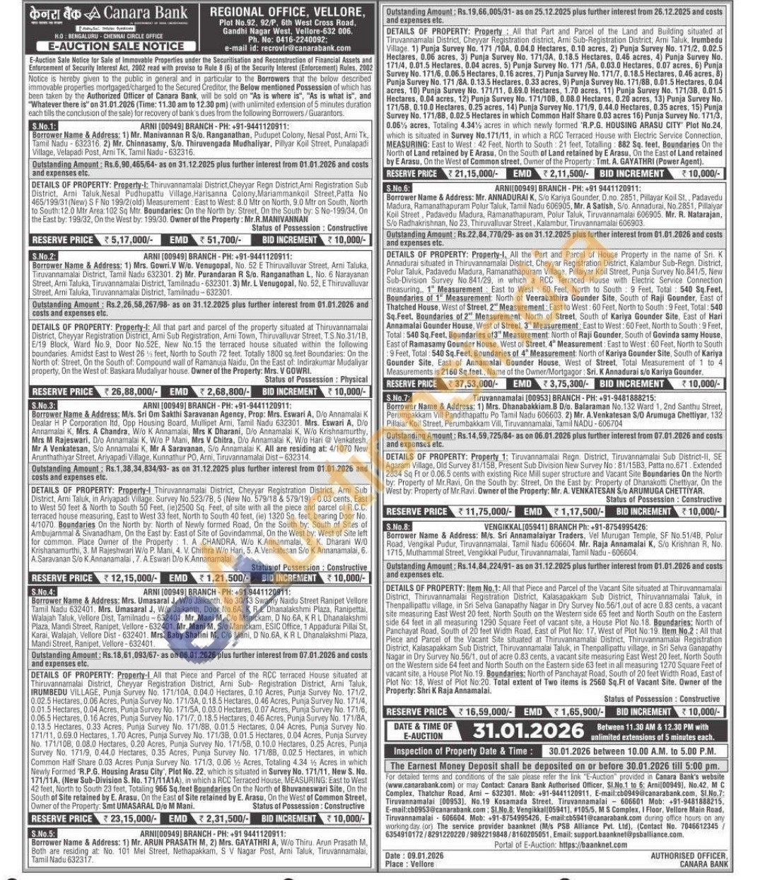 4) All that Piece and Parcel of the RCC terraced House situated at Thiruvannamalai District, Cheyyar Registration District, Arni Sub- Registration District, Arni Taluk, IRUMBEDU VILLAGE, Punja Survey No. 171/10A, 0.04.0 Hectares, 0.10 Acres, Punja Survey No. 171/2, 0.02.5 Hectares, 0.06 Acres, Punja Survey No. 171/3A, 0.18.5 Hectares, 0.46 Acres, Punja Survey No. 171/4, 0.01.5 Hectares, 0.04 Acres, Punja Survey No. 171/5A, 0.03.0 Hectares, 0.07 Acres, Punja Survey No. 171/6, 0.06.5 Hectares, 0.16 Acres, Punja Survey No. 171/7, 0.18.5 Hectares, 0.46 Acres, Punja Survey No. 171/8A, 0.13.5 Hectares, 0.33 Acres, Punja Survey No. 171/8B, 0.01.5 Hectares, 0.04 Acres, Punja Survey No. 171/11, 0.69.0 Hectares, 1.70 Acres, Punja Survey No. 171/38, 0.01.5 Hectares, 0.04 Acres, Punja Survey No. 171/108, 0.08.0 Hectares, 0.20 Acres, Punja Survey No. 171/58, 0.10.0 Hectares, 0.25 Acres, Punja Survey No. 171/9, 0.44.0 Hectares, 0.35 Acres, Punja Survey No. 171/88, 0.02.5 Hectares, in which Common Half Share 0.03 Acres Punja Survey No. 171/3, 0.06% Acres, Totaling 4.34% Acres in which Newly Formed "R.P.G. Housing Arasu City', Plot No. 22, which is situated in Survey No. 171/11. New S. No. 171/11A. (New Sub-Division S. No. 171/11A1A), in which a RCC Terraced House, MEASURING: East to West 42 feet, North to South 23 feet, Totaling 966 Sq.feet Boundaries On the North of Bhuvaneswari Site, On the South of Site retained by E. Arasu. On the East of Site retained by E. Arasu, On the West of Common Street, Owner of the Property: Smt UMASARAL D/o M Mani