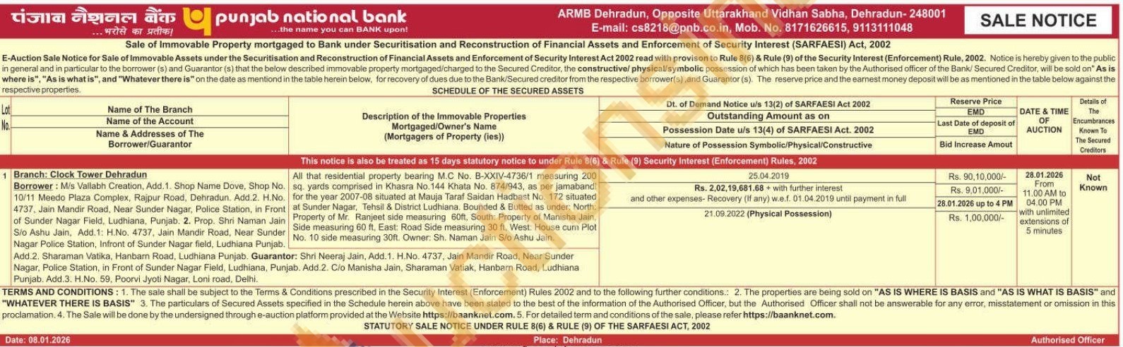 All that residential property bearing M.C No. B-XXIV-4736/1 measuring 200 sq. yards comprised in Khasra No. 144 Khata No. 874/943, as per jamabandi for the year 2007-08 situated at Mauja Taraf Saidan Hadbast No. 172 situated at Sunder Nagar, Tehsil & District Ludhiana. Bounded & Butted as under: North: Property of Mr. Ranjeet side measuring 60ft. South: Property of Manisha Jain Side measuring 60 ft, East: Road Side measuring 30 ft, West: House cum Plot No. 10 side measuring 30ft. Owner: Sh. Naman Jain Sio Ashu Jain