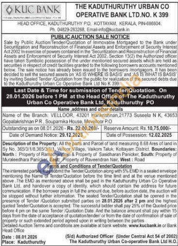 Description of the Property: All the parts and Parcel of land measuring 8.68 Ares of land in Sy No. 365/3/1/8,365/3/1/1, Velibor Village, Vaikom Taluk, Kottayam District Boundaries: North: Property of Ramachandran & Property of Sasidharan Panicker, South: Property of Muraleedhara Panicker, East: Property of Raveendran Nair, West: Road