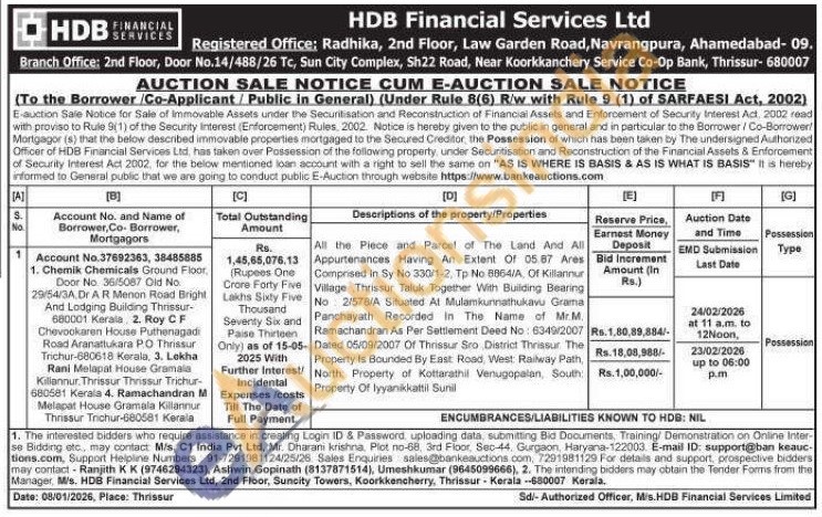 All the Piece and Parcel of The Land And All Appurtenances Having An Extent Of 05.87 Ares Comprised In Sy No 330/1-2, Tp No 8864/A, Of Killannur Village Thrissur Taluk Together With Building Bearing No 2/578/A Situated At Mulamkunnathukavu Grama Panchayath Recorded In The Name of Mr.M. Ramachandran As Per Settlement Deed No: 6349/2007 Dated 05/09/2007 Of Thrissur Sro District Thrissur The Property Is Bounded By East Road, West: Railway Path North: Property of Kottarathil Venugopalan, South: Property Of lyyanikkattil Sunil