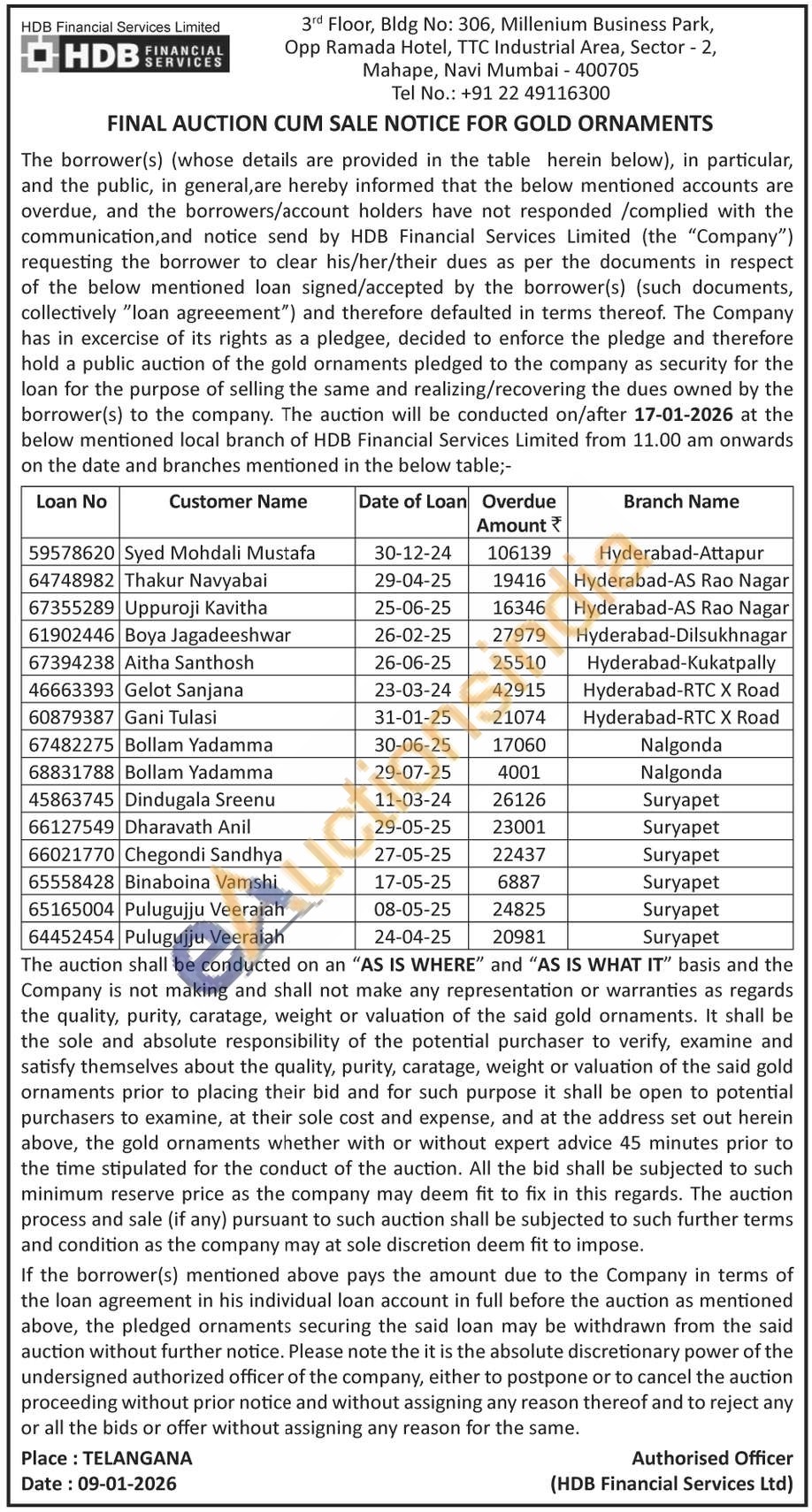 HDB Financial Services Limited Gold Auctions Auction in Hyderabad