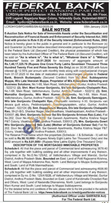 Schedule-II: All that the piece and parcel of Commercial land admeasuring 4936.80 Sq. yds together with building existing and all other improvements if any thereon. comprised in Sy no. D No. 125/A1B2B, of Vatticherukuru Village and Mandal, Guntur District, Andhra Pradesh State, Bounded on East Land of Kandimalla Chowdari Rao and Others, West: Land of Nadendla Dhanamma, North: Land belongs to Gorijavolu Mani Kumar and South: Land belongs to Muppa Subbayamma