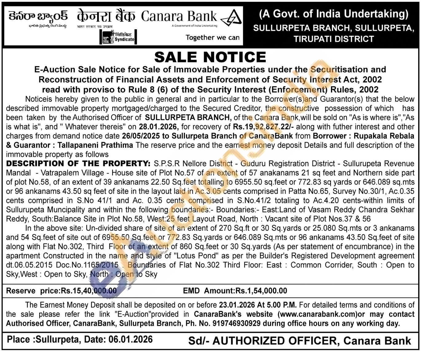 Mandal Vatrapalem Village House site of Plot No.57 of an extent of 57 anakanams 21 sq feet and Northern side part of plot No.58, of an extent of 39 ankanams 22.50 Sq.feet totalling to 6955.50 sq.feet or 772.83 sq yards or 646.089 sq.mts or 96 ankanams 43.50 sq feet of site in the layout laid in Ac.3.05 cents comprised in Patta No.65, Survey No.30/1, Ac.0.35 cents comprised in S.No 41/1 and Ac. 0.35 cents comprised in S.No.41/2 totaling to Ac.4.20 cents-within limits of Sullurupeta Muncipality and within the following boundaries:- Boundaries:- East:Land of Vasam Reddy Chandra Sekhar Reddy, South: Balance Site in Plot No.58, West:25 feet Layout Road, North: Vacant site of Plot Nos.37 & 56