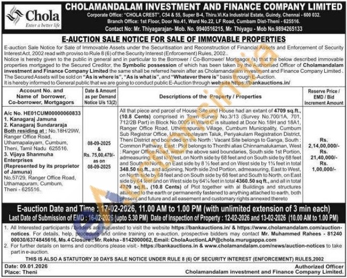 All that piece and parcel of House Site und House had an extant of 4709 sq.ft., (10.8 Cents) comprised in Town Survey No.3/13 (Survey No.700/1A, 701, 712/2B Part) in Block No.0005 in Ward C is situated at Door No. 18H and 18A1, Ranger Office Road, Uthemapuram Village, Cumbum Municipality, Cumbum Sub Registrar Office, Uthamapalayam Taluk, Periyakulam Registration District, Theni District and bounded on the North: Vacant Site belongs to Ganga, South: Common Pathway, East: Plot belongs to Thonthi alias Chinnamalukaman, West Ranger Office Road, within the above said boundaries, South side 1st Portion, admeasuring, East to West, on North side by 68 feet and on South side by 68 feet and South to North, on East side by 85 feet and on West side by 1% feet in total 348.50 sq.ft., and adjoining, North side 2nd Portion, admeasuring, East to West, on North side by 68 feet and on South side by 68 feet and South to North, on East side by 64 feet and on West side by 64% feet in total 4360.50 sq ft., and all in total 4709 sq.ft., (10.8 Cents) of Plot together with al Buildings and structures attached to the earth or permanently fastened to anything attached to earth, both present and future and all easement and customary rights annexed thereto