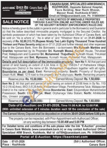 Details and full description of the immovable property: Item No 1: All that part and parcel of land having an extent of 4.04 Ares in Sy No. 158/2A-7 of Pathaikara Village. Malappuram District in the name of Sn. Muhammed Thajudheen together with all rights Boundaries as per deed: East: Remaining property: South: Property of Bunglowil Ussan Kull, West: 12 ft road to this property and Kudiyiruppu, North: Remaining property