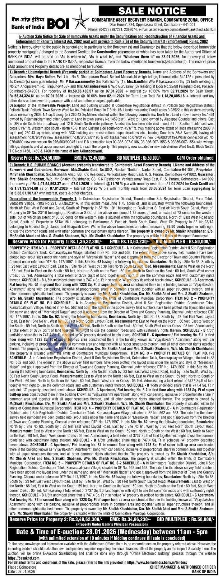 Description of the Immoveable Property 1: In Coimbatore Registration District, Thondamuthur Sub Registration District, Perur Taluk, Vedapatti Village, Patta No.221, S.F.No.23/1A, in this extent measuring 1.75 acres of land is situated within the following boundaries, North of: East West Road and Canal, South of: Property in SF No. 19/1 belonging to Ravikumar S. East of: North South Canal, West of: Property in SF No. 23/1B belonging to Ravikumar S Out of the above mentioned 1.75 acres of land, an extent of 73 cents on the western side, out of which an extent of 36.50 cents on the western side is situated within the following boundaries, North of: East West Road and Canal, South of: Property in SF.No.19/1 belonging to Ravikumar S. East of: North South Canal, West Of: Property in SF. No.23/1A belonging to Govind Singh Janoti and Bhagwati Devi. Within the above boundaries an extent measuring 36.50 cents together with right to use the common roads and with other common and customary rights thereon. The property is owned by Mr. Shaikh Khushbahar, S/o. Mr.Shaikh Ahad and Mrs. S. Shaikh Shabnam, W/o. Mr. Shaikh Khushbahar. The property is within the limits of Vedapatti Panchayat