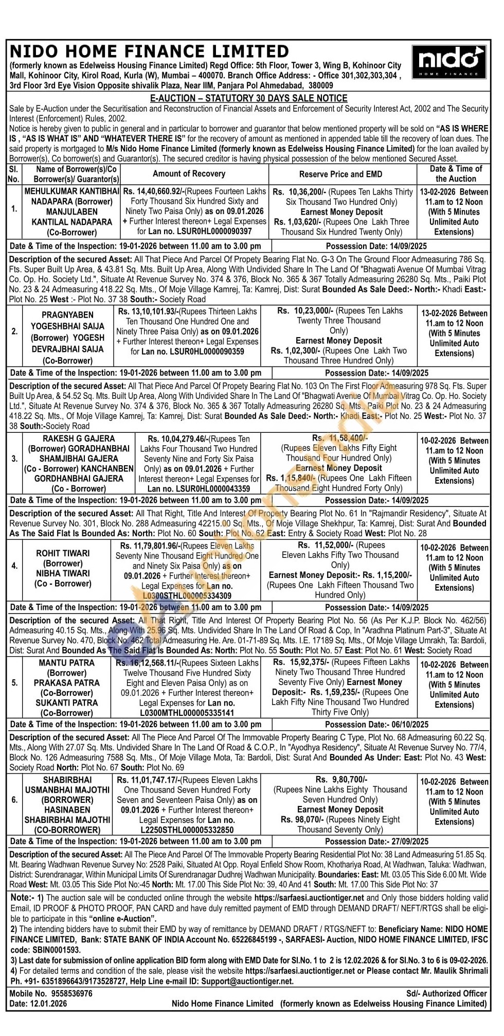 Description of the secured Asset: All The Piece And Parcal Of The Immovable Property Bearing C Type, Plot No. 68 Admeasuring 60.22 50 Mts. Along With 27:07 Sq. Mts. Undivided Sharm In The Land Of Road & COP, In "Ayodhya Residency, Situale At Revenue Survey No. 7714, Block No. 126 Admeasuring 7588 Sq. Mts, Of Moje Village Mota, Ta Bardoll, Dist. Surat And Bounded As Under: East: Plot No. 43 West: Society Road North: Plot No. 67 South: Plot No. 60