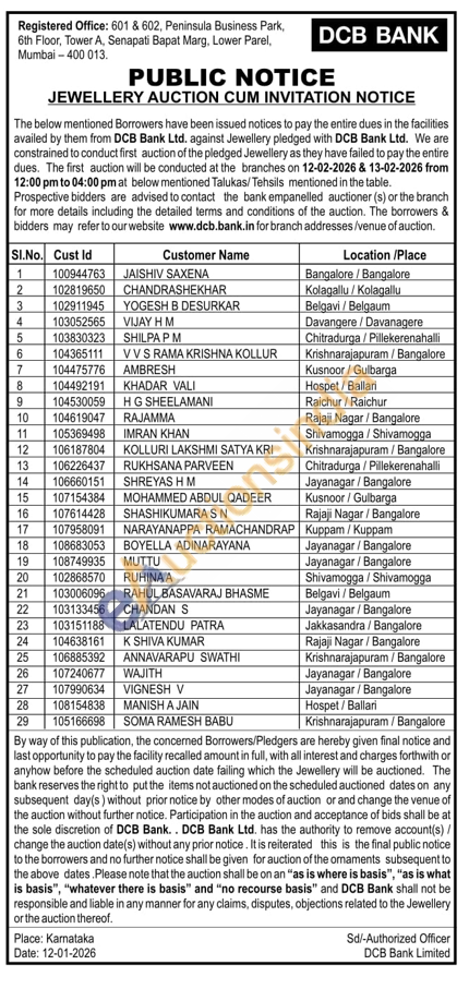DCB Bank Gold Auctions Auction in Bengaluru