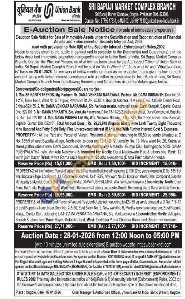 All the Part and Parcel of Vacant Residential site admeasuring to 96.80 sq yards situated at D No. 535/5 of west Bapatla village, North side to door no. 13-11-21/2, Locality No. 13, New ward No.26, Kotravari street, patha kabela area, Darsi Compound, Bapatla Municipality & Mandal, Guntur Dist., belonging to MRS. DAMA PUSHPALATHA, w/o. Venkata Narayana & bounded by: North: Darsi Nageswara Rao & others site, East: 12 width joint bazar, West: Kotra Rama rao's house site, South: executants (Dama Pushpalatha) house.
