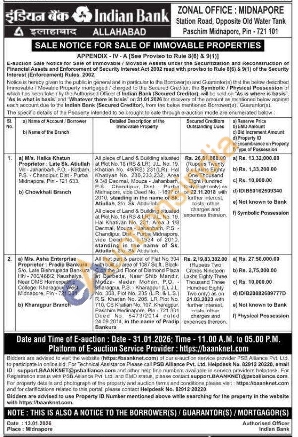All that part & parcel of Fiat No 304 with built up area of 1087 Sq.ft. Block-Con the 3rd Floor of Diamond Plaza at Barbetia, Near Shib Mandir, Mouza Madan Mohan, P.O. Kharagpur, P.S.Kharagpur (L), J.L No. 308, Plot No. 235 (LR. & L.S.) R.S. Khatian No. 205, LR Plot No. 710, CS Khatian No. 107, Kharagpur, Paschim Medinapore. Pin-721 301 Deed No. 5473/2014 dated 24.09.2014, in the name of Pradip Bankura