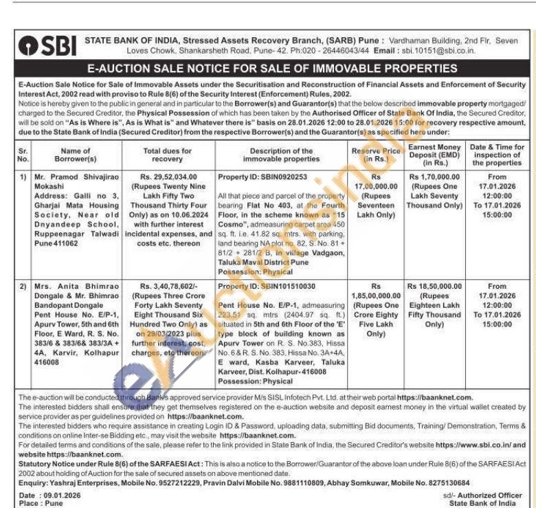 Pent House No. E/P-1, admeasuring 223.51 sq. mtrs (2404.97 sq. ft.) situated in 5th and 6th Floor of the 'E' type block of building known as Apurv Tower on R. S. No.383, Hissa No. 6 & R. S. No. 383, Hissa No. 3A+4A, E ward, Kasba Karveer, Taluka Karveer, Dist. Kolhapur-416008 Possession: Physical
