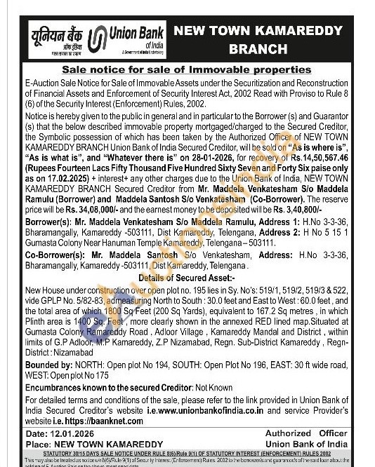 vide GPLP No. 5/82-83, admeasuring North to South: 30.0 feet and East to West: 60.0 feet, and the total area of which 1800 Sq Feet (200 Sq Yards), equivalent to 167.2 Sq metres, in which Plinth area is 1400 Sq. Feet, more clearly shown in the annexed RED lined map. Situated at Gumasta Colony Ramareddy Road, Adloor Village, Kamareddy Mandal and District, within limits of G.P Adloor, M.P Kamareddy, Z.P Nizamabad, Regn. Sub-District Kamareddy, Regn-District: Nizamabad Bounded by: NORTH: Open plot No 194, SOUTH: Open Plot No 196, EAST: 30 ft wide road, WEST: Open plot No 175