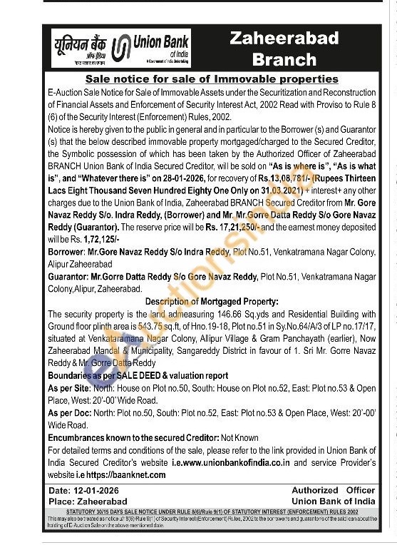 The security property is the land admeasuring 146.66 Sq.yds and Residential Building with Ground floor plinth area is 543.75 sq.ft, of Hno. 19-18, Plot no.51 in Sy.No.64/A/3 of LP no. 17/17, situated at Venkataramana Nagar Colony, Allipur Village & Gram Panchayath (earlier), Now Zaheerabad Mandal & Municipality, Sangareddy District in favour of 1. Sri Mr. Gorre Navaz Reddy & Mr. Gorre Datta Reddy Boundaries as per SALE DEED & valuation report As per Site: North: House on Plot no.50, South: House on Plot no.52, East: Plot no.53 & Open Place, West: 20'-00' Wide Road.