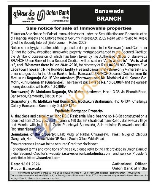 All that piece and parcel of existing RCC Residential Mulgi bearing no. 1-3-38 constructed on a open plot adm 21 Sq. yds, Built up area is 189 Sq.feet situated at main Road, Banswada village and Mandal with in limit of Gram Panchayat Banswada, Sub registrar Banswada and dist Registrar Nizamabad. Boundaries of the property: East: Mulgi of Paltha Chiranjeevlu, West: Mulgi of Chidura Gangaiah, North: 18'feet Wide GP Road, South: 3' feet Wide Road
