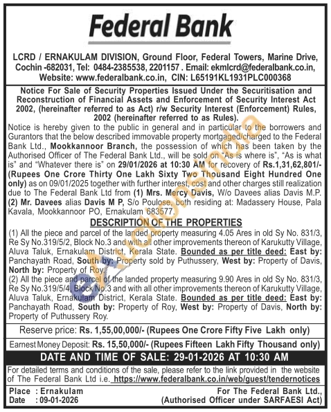 (1) All the piece and parcel of the landed property measuring 4.05 Ares in old Sy No. 831/3, Re Sy No.319/5/2, Block No.3 and with all other improvements thereon of Karukutty Village, Aluva Taluk, Ernakulam District, Kerala State. Bounded as per title deed: East by: Panchayath Road, South by: Property sold by Puthussery, West by: Property of Davis, North by: Property of Roy.