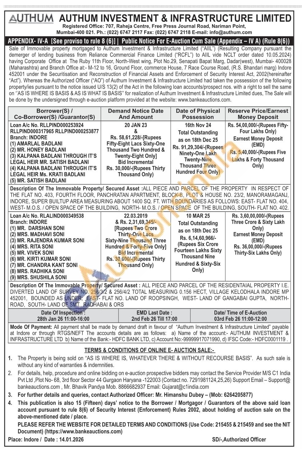 Description Of The Immovable Property/ Secured Asset: ALL PIECE AND PARCEL OF THE RESIDENTAIAL PROPERTY I.E. DIVERTED LAND OF SURVEY ΝΟ. 256/3/2 & 256/4/2 TOTAL MEASURING 0.156 HECT, VILLAGE KELODHALA INDORE MP 452001, BOUNDED AS UNDER; EAST- FLAT NO. LAND OF ROOPSINGH, WEST- LAND OF GANGABAI GUPTA, NORTH-ROAD, SOUTH-LAND OF SMT. RADHABAI & ORS