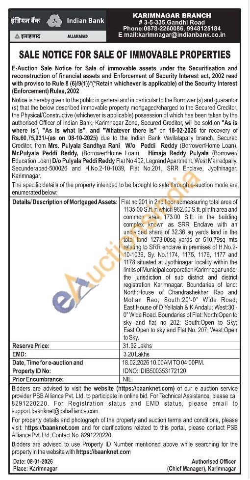 Flat no 201 in 2nd floor admeasuring total area of 1135.00 S.ft.in which 962.00 S.ft. plinth area and common area 173.00 S.ft. in the building. complex known as SRR Enclave with an undivided share of 32.36 sq yards land in the total land 1273.00sq yards or 510.79sq mts relating to SRR enclave in premises of H.No.2-10-1039, Sy. No.1174, 1175, 1176, 1177 and 1178 situated at Jyothinagar locality within the limits of Municipal corporation Karimnagar under the jurisdiction of sub district and district registration Karimnagar. Boundaries of land: North House of Chandrashekhar Rao and Mohan Rao; South:20'-0" Wide Road; East: House of D Yellaiah & K Andalu; West:30'-0° Wide Road. Boundaries of Flat: North: Open to sky and flat no 202; South: Open to Sky; East: Open to sky and Flat No. 207; West: Open to Sky.
