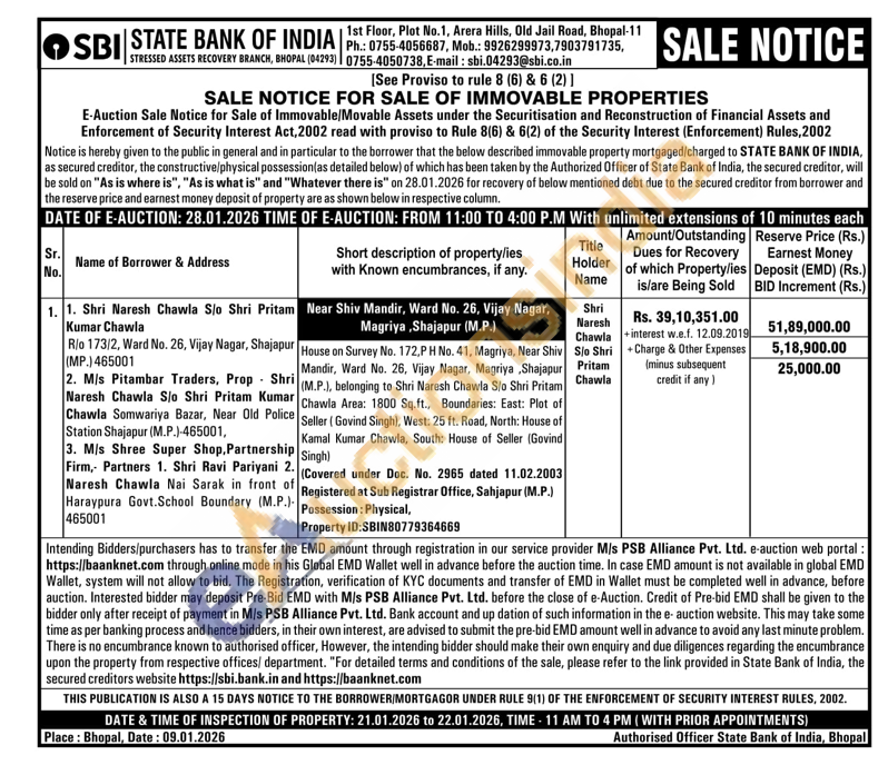 House on Survey No. 172,P H No. 41, Magriya, Near Shiv Mandir, Ward No. 26, Vijay Nagar, Magriya, Shajapur (M.P.), belonging to Shri Naresh Chawla S/o Shri Pritam Chawla Area: 1800 Sq.ft., Boundaries: East: Plot of Seller (Govind Singh), West: 25 ft. Road, North: House of Kamal Kumar Chawla, South: House of Seller (Govind Singh)