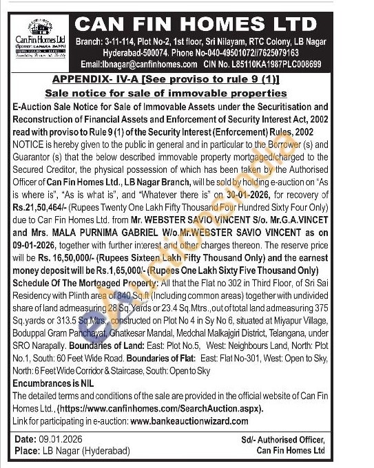 All that the Flat no 302 in Third Floor, of Sri Sai Residency with Plinth area of 840 Sq.ft (Including common areas) together with undivided share of land admeasuring 28 Sq. Yards or 23.4 Sq. Mtrs., out of total land admeasuring 375 Sq.yards or 313.5 Sq.Mtrs., constructed on Plot No 4 in Sy No 6, situated at Miyapur Village, Boduppal Gram Panchayat, Ghatkesar Mandal, Medchal Malkajgiri District, Telangana, under SRO Narapally. Boundaries of Land: East: Plot No.5, West: Neighbours Land, North: Plot No.1, South: 60 Feet Wide Road. Boundaries of Flat: East: Flat No-301, West: Open to Sky, North: 6 Feet Wide Corridor & Staircase, South: Open to Sky.