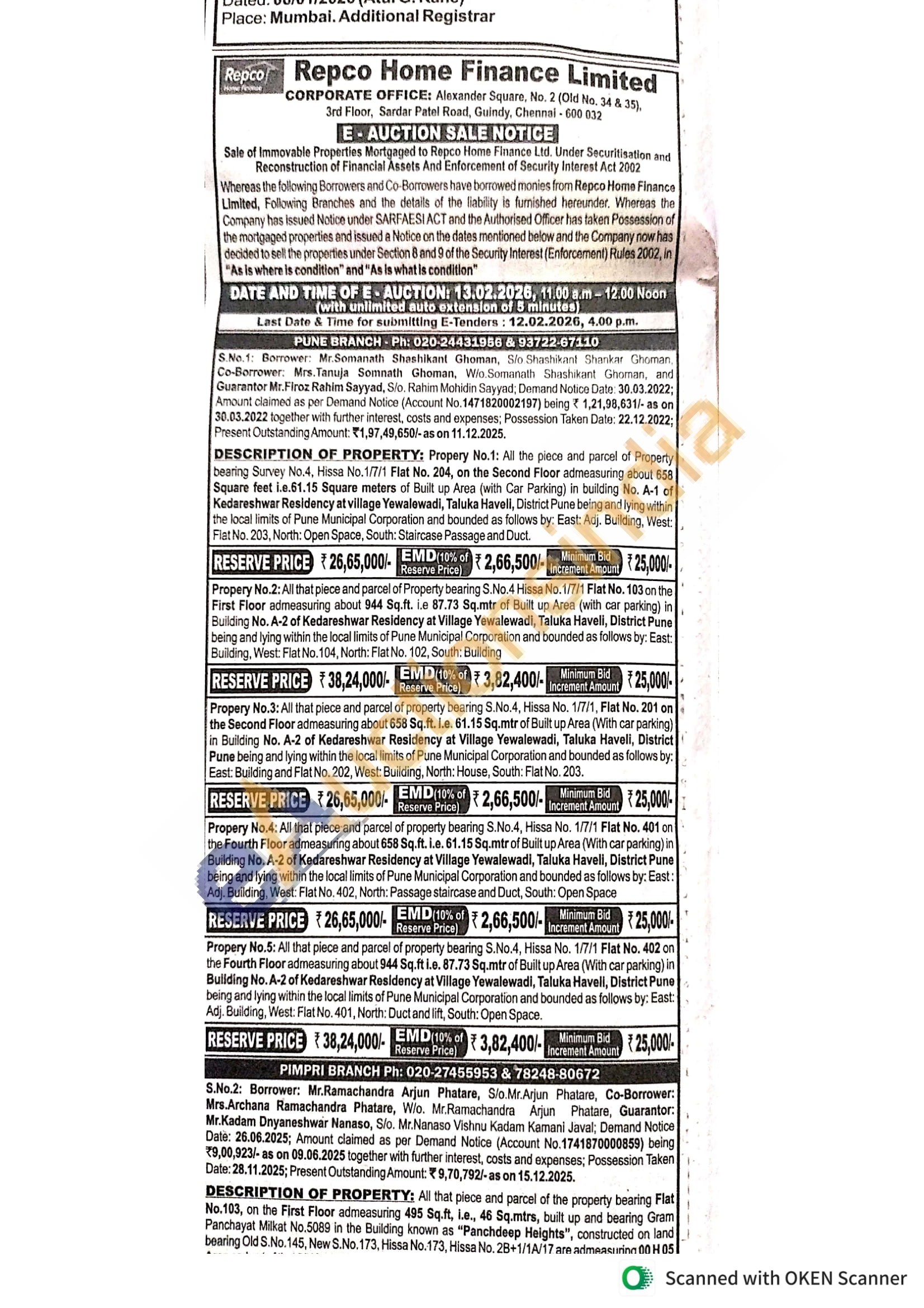 Propery No.2: All that piece and parcel of Property bearing S.No.4 Hissa No. 1/7/1 Flat No. 103 on the First Floor admeasuring about 944 Sq.ft. i.e 87.73 Sq.mtr of Built up Area (with car parking) in, Building No. A-2 of Kedareshwar Residency at Village Yewalewadi, Taluka Haveli, District Pune being and lying within the local limits of Pune Municipal Corporation and bounded as follows by: East: Building, West: Flat No. 104, North: Flat No. 102, South: Building