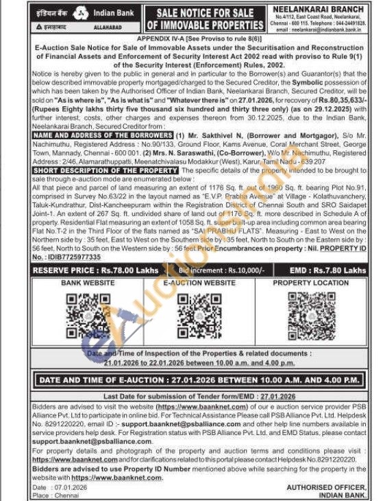 All that piece and parcel of land measuring an extent of 1176 Sq. ft. out of 1960 Sq. ft. bearing Plot No.91, comprised in Survey No.63/22 in the layout named as "EVP Prabha Avenue" at Village - Kolathuvanchery, Taluk-Kundrathur, Dist-Kancheepuram within the Registration District of Chennai South and SRO Saidapet Joint-1. An extent of 267 Sq. ft. undivided share of land out of 1176 Sq. ft. more described in Schedule A of property. Residential Flat measuring an extent of 1058 Sq. ft. super built-up area including common area bearing Flat No.T-2 in the Third Floor of the flats named as "SAI PRABHU FLATS Measuring-East to West on the Northern side by: 35 feet, East to West on the Southem side by: 35 feet, North to South on the Eastern side by 56 feet, North to South on the Western side by: 56 feet. Prior Encumbrances on property: Nil. PROPERTY ID No.: IDIB7725977335
