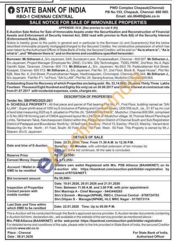 A-SCHEDULE PROPERTY: All that piece and parcel of Flat bearing Flat No. F1, First Floor, building named as "SAI ILLAM", Super plinth area of 1050 sq. ft. (inclusive of Parking and Common areas), UDS 556 sq.ft., (ie., 51.67 sq.ml.) out of land total measuring 2025 sq.ft situated on Plot No 24, "SARANG AVENUE", Mudichur, Chennai-600 064, comprised in S.No.363/1B forming part of CMDA approved layout No-L24/2004 of Mudichur village, St. Thomas Mount Panchayat Limits, Tambaram Taluk, Kancheepuram District within the Registration District of Chennai South and Sub Registration District of Padappai and Boundaries: North by: 30 feet road, South by: Plot of 13. East by: Plot 23, West by: Vacant land. Measuring On the North: 41 Feet, South: 40 Feet, East: 50 Feet, West 50 Feet. This Property is owned by Mr.J. Sitaram, S/o G. Jayamani