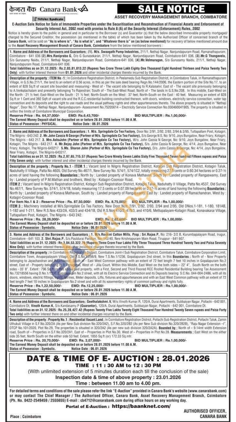 Description of the property: Property No.1: Residential Vacant Land: In Coimbatore Registration District, Pollachi Sub Registration District, Pollachi Taluk, Zamin Uthukuli Village in S.F.No.320/2A (As per New Sub division No. 320/2A2), S.F.No.320/282 (As per New Sub division No.320/2828), "Raju Nagar Extension-I". DTCP No.101/2020. Plot No.29, The properties is situated in 320/2A2 (As per new sub division 320/2A2A). Bounded by: North of-9.14mt width Extension road, South of Properties in S.F.No.320/2A1, East of Properties in Plot No.30, West of Properties in Plot No.28. Measurements: East West on the either side 35 feet, North South on the either side 53 feet. Extent, 1855 Sq.ft (or) 172.33 Sq.mtr