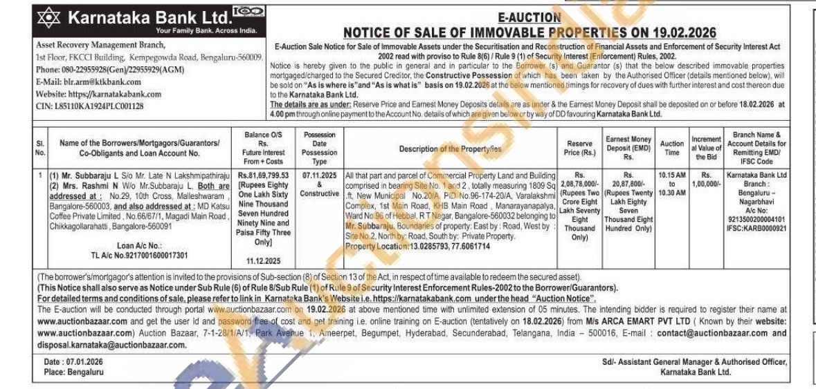 All that part and parcel of Commercial Property Land and Building comprised in bearing Site No. 1 and 2, totally measuring 1809 Sq ft. New Municipal No.20/A, PID No.96-174-20/A, Varalakshmi Complex, 1st Main Road, KHB Main Road Manarayanapalya. Ward No.96 of Hebbal, RT Nagar, Bangalore-560032 belonging to Mr. Subbaraju. Boundaries of property: East by: Road, West by Site No. 2. North by: Road, South by: Private Property