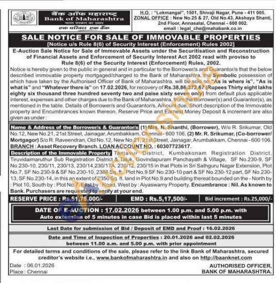 Tanjavur District, Kumbakonam Registration District, Tiruvidaimaruthur Sub Registration District & Taluk, Govindapuram Panchayath & Village, SF No.230-9, SF No.230-10, 230/11, 230/13, 230/14,230/17A, 230/12, 230/15 in that Plots in Sri Sathguru Nagar Extension, Plot No.7, SF No.230-9 & SF No.230-10, 2388 Sq. ft., Plot No.9 SF No. 230-10 part & SF No.230-12 part, SF No.230-13, SF No.230-14, in this an extent of 2350 Sq. ft. land in Plot No.9 and building thereat bounded on the North by Plot 10, South by: Plot No.7, East by: Road, West by: Alyaswamy Property. Encumbrance: Nil. As known to Bank. Purchasers are requested to verify at your end.