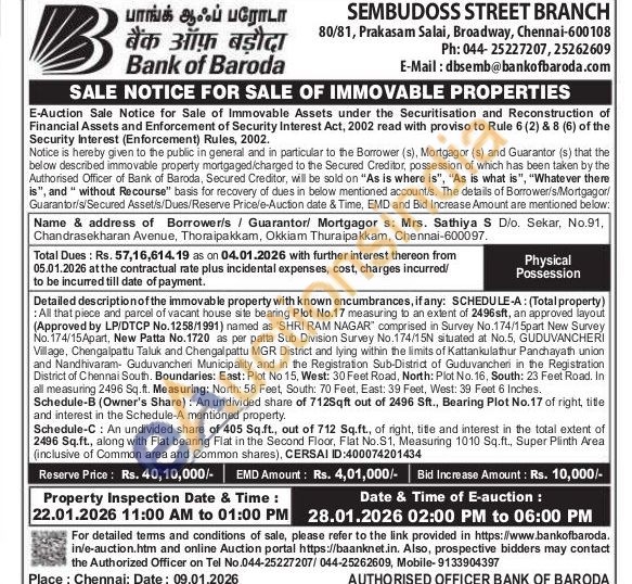 Detailed description of the immovable property with known encumbrances, if any: SCHEDULE-A: (Total property) : All that piece and parcel of vacant house site bearing Plot No.17 measuring to an extent of 2496sft, an approved layout (Approved by LP/DTCP No.1258/1991) named as 'SHRI RAM NAGAR" comprised in Survey No.174/15part New Survey No. 174/15Apart, New Patta No. 1720 as per patta Sub Division Survey No.174/15N situated at No.5, GUDUVANCHERI Village, Chengalpattu Taluk and Chengalpattu MGR District and lying within the limits of Kattankulathur Panchayath union and Nandhivaram- Guduvancheri Municipality and in the Registration Sub-District of Guduvancheri in the Registration District of Chennai South. Boundaries: East: Plot No 15, West: 30 Feet Road, North: Plot No. 16, South: 23 Feet Road. In all measuring 2496 Sq.ft. Measuring: North: 58 Feet, South: 70 Feet, East: 39 Feet, West: 39 Feet 6 Inches. Schedule-B (Owner's Share): An undivided share of 712Sqft out of 2496 Sft., Bearing Plot No.17 of right, title and interest in the Schedule-A mentioned property. Schedule-C: An undivided share of 405 Sq.ft., out of 712 Sq.ft., of right, tiffe and interest in the total extent of 2496 Sq.ft., along with Flat bearing Flat in the Second Floor, Flat No.S1, Measuring 1010 Sq.ft., Super Plinth Area (inclusive of Common area and Common shares), CERSAI ID:400074201434