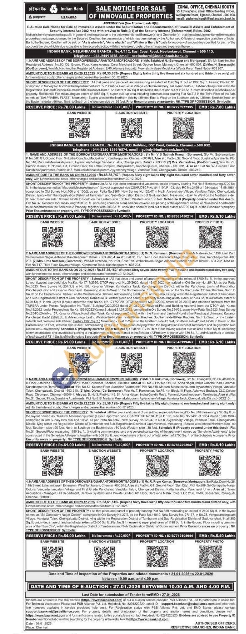 All that piece and parcel of property bearing Plot No. 589 measuring an extent of 2400 Sq. ft in the layout named as "Sri Ganapathy Nagar Colony, comprised in Old Survey No.27/2, as per Patta No. 11010, New Survey No. 27/177, in No.23, Vengadamangalam Village, Vandalur Taluk, Chengalpattu District, lying within the Registration District of Tambaram and Sub-Registration District of Guduvancheri. In all 300 Sq. ft, unidivided share of land out of total extent of 2400 Sq. ft., Flat No. G1 measuring super plinth area of 1198 Sq. ft. in the Ground Floor including common area of the "Sun City", within the Registration District of Tambaram and Sub Registration District of Guduvancheri. Prior Encumbrances on property: Nil. TYPE OF POSSESSION: Symbolic