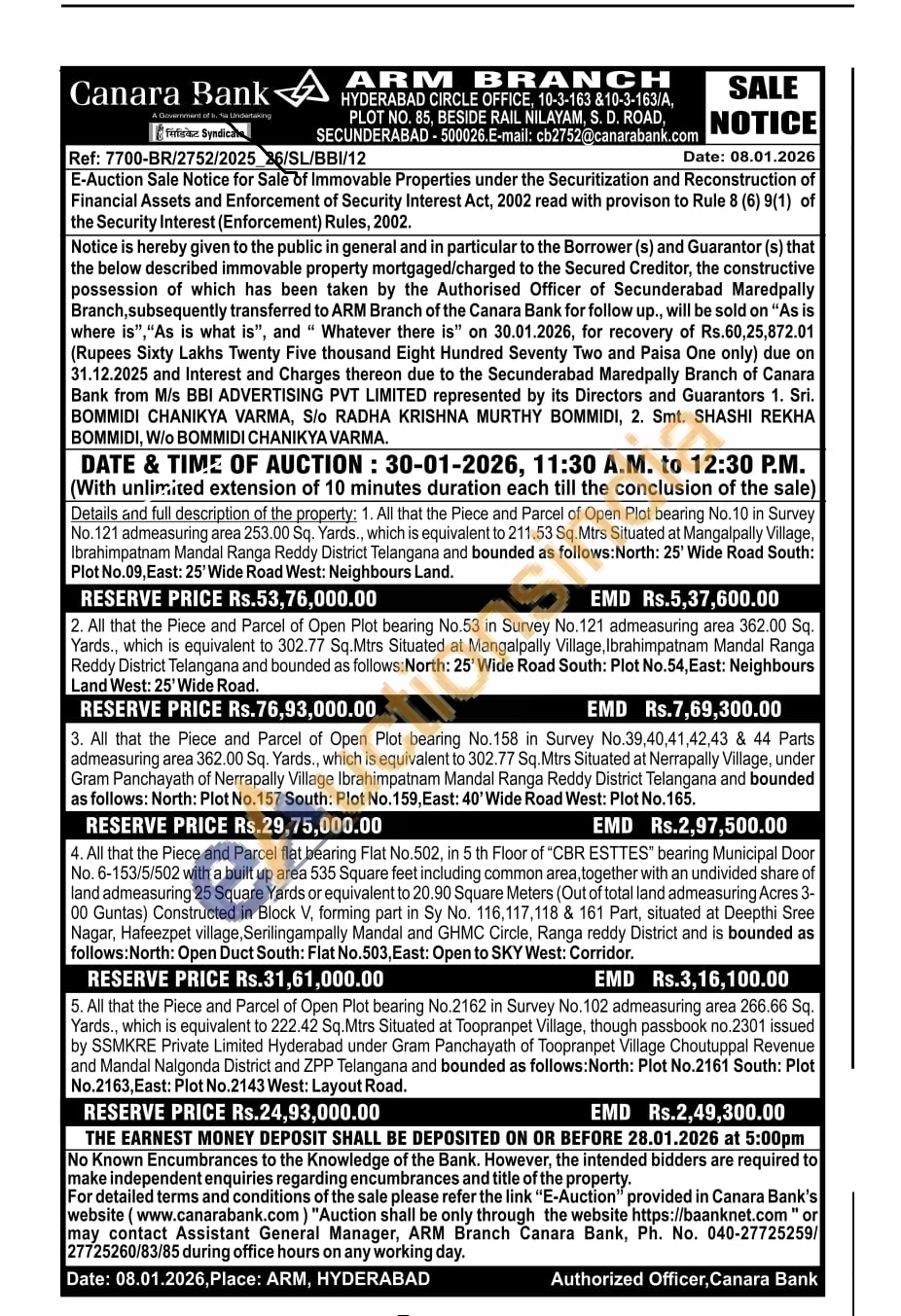All that the Piece and Parcel of Open Plot bearing No.53 in Survey No.121 admeasuring area 362.00 Sq. Yards., which is equivalent to 302.77 Sq.Mtrs Situated at Mangalpally Village, Ibrahimpatnam Mandal Ranga Reddy District Telangana and bounded as follows: North: 25' Wide Road South: Plot No.54, East: Neighbours Land West: 25' Wide Road