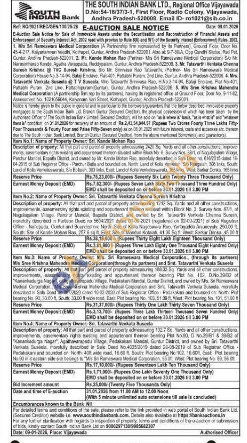 Description of property: All that part and parcel of property admeasuring 188.33 Sq Yards and all other constructions, improvements, easementary rights existing and appurtenant thereon bearing Plot No. 102, D.No 39/82 of "Kanankadurga Nagar", of Agathavarapadu Village, Pedakakani Mandal, Guntur District, and owned by Ms. Sn Rameswara Medical Corporation., Mis Sree Krishna Mahendra Medical Corporation and Smt. Tatavarthi Venkata Suseela, morefully described in Sale Deed no 387/2020 dated 10-02-2020 of Sub Registrar Office-Pedakakani and bounded on: North: Plot bearing No. 90, 33:00 ft, Seuth: 33.00 ft wide road, East: Plot bearing No. 103, 51.09 ft. West: Plot bearing No. 101, 51.00 ft