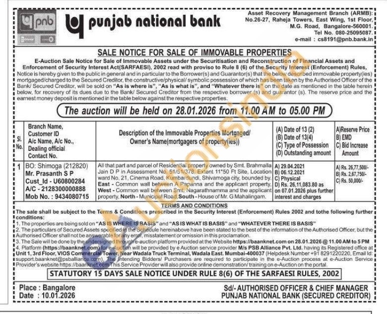 All that part and parcel of Residential property owned by Smt. Brahmaila Jain DP in Assessment No. 51/51/378, Extent 11°50 Ft Site, Location ward No. 21, Cinema Road, Kumbardundi, Shivamoga city, bounded by. East Common wall between A Papanna and the applicant property. West-Common wall between Smt. Nagarathnamma and the applicant property, North-Municipal Road, South-House of Mr. G Mahalingam.