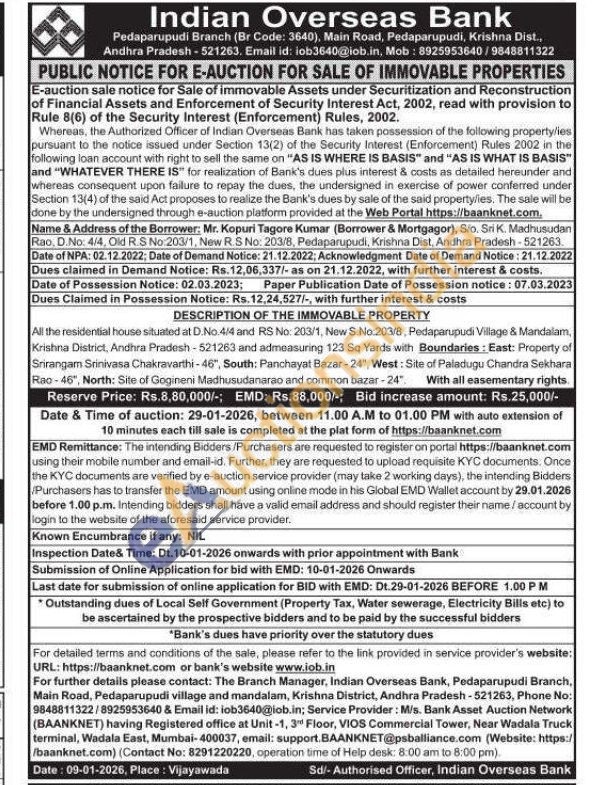 All the residential house situated at D.No.4/4 and RS No: 203/1, New S.No:203/8, Pedaparupudi Village & Mandalam, Krishna District, Andhra Pradesh-521263 and admeasuring 123 Sq Yards with Boundaries: East: Property of Srirangam Srinivasa Chakravarthi-46", South: Panchayat Bazar-24", West: Site of Paladugu Chandra Sekhara Rao-46", North: Site of Gogineni Madhusudanarao and common bazar-24" With all easementary rights.