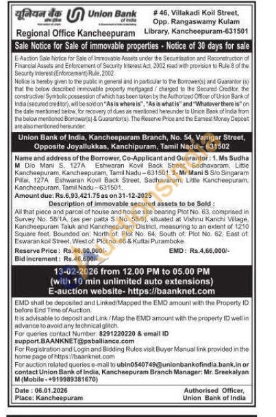 All that piece and parcel of house and house site bearing Plot No. 63, comprised in Survey No. 58/1A, (as per patta S. No. 58/5), situated at Vishnu Kanchi Village Kancheepuram Taluk and Kancheepuram District, measuring to an extent of 1210 Square feet. Bounded on: North of Plot No. 64, South of Plot No. 62, East of Eswaran koil Street, West of Plat no. 66 & Kuttai Puramboke