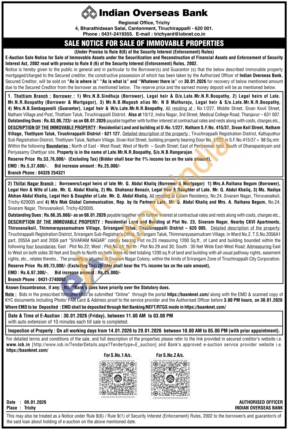 : Residential Land and Building at Plot No. 23, Sivaram Nagar, Nearby CKVI Apartments, Thiruvanaikoil, Thimmarayasamudram Village, Srirangam Taluk, Tiruchirappalli District 620 005. Detailed description of the property: Tiruchirappalli Registration District, Srirangam Sub-Registrar's Office, Srirangam Taluk, Thimmarayasamudram Village, in Ward No.2. T.S.No.2056A1 part, 2055A part and 2059 part "SIVARAM NAGAR" colony bearing Plot no.23 measuring 1200 Sq.ft., of Land and building bounded within the following four boundaries: East: Plot No.22; West: Plot No.24; North: Plot No.29 and 30; South: 30 feet Wide East-West Road; Admeasuring East to West on both sides 30 feet and South to North on both sides 40 feet totaling 1200 sq.ft of land and building with all usual pathway rights, easement rights, etc., relates thereto., The property is situated at Sivaram Nagar Colony, within the limits of Srirangam Zone of Tiruchirappalli City Corporation.