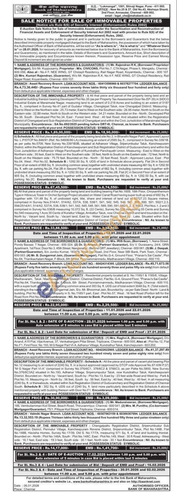 DESCRIPTION OF THE IMMOVABLE PROPERTY: Schedule A: All the piece and parcel of vacant plot bearing Plot No. 12 measuring to an extent of 2240 Sq. ft. in a layout approved (approved by DTCP vide Approval No.87-6/M.P.37) "M G Nagar Part VI-A comprised in Survey No. 376/6C1, 376/6C2 & 3766C3, as per Patta No.5850, New Survey No.376/6C3A2 situated in No. 193, Adhanur Village, Sriperumpudur Taluk, now Kundrathur Taluk, Kancheepuram District. Bounded on-North by: Vacant land, South by: Plot No 13, East by: 23 feet wide Road and West by: Park & Plot No. 10. Measuring on-North by: 56 feet, South by 56 feet, East by: 40 feet, West by: 40 feet. In all measuring 2240 Sq. ft. or thereabouts, situated within Sub Registration District of Guduvanchery and Registration District of Chennai South. Schedule B: 352 Sq. ft. UDS out of 2240 Sq. ft. land more particularly described in the Schedule A above mentioned property with building thereon with Door No.F1. Encumbrance: Nil. As known to Bank. Purchasers are requested to verify at your end. POSSESSION STATUS: SYMBOLIC.