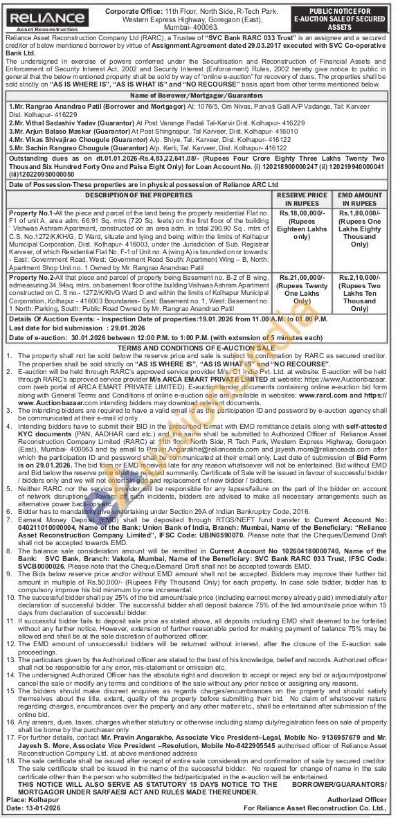 Property No.2-All that piece and parcel of property being Basement no. B-2 of B wing. admeasuring 34.94sq, mtrs. on basement floor of the building Vishwas Ashram Apartment constructed on C. S no.- 1272/K/Kh/G Ward D and within the limits of Kolhapur Municipal Corporation, Kollhapur - 416003 Boundaries- East: Basement no. 1, West: Basement no. 1 North: Parking, South: Public Road Owned by Mr. Rangrao Anandrao Patil