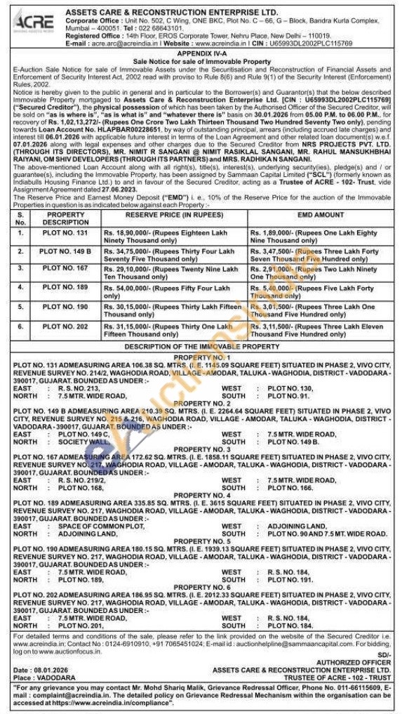 PROPERTY NO. 1 : PLOT NO. 131 ADMEASURING AREA 106.38 SQ. MTRS. (I. E. 1145.09 SQUARE FEET) SITUATED IN PHASE 2, VIVO CITY, REVENUE SURVEY NO. 214/2, WAGHODIA ROAD, VILLAGE-AMODAR, TALUKA-WAGHODIA, DISTRICT-VADODARA-390017, GUJARAT. BOUNDED AS UNDER:-