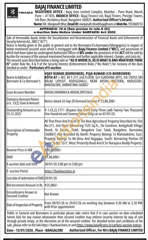 All That Piece And Parcel Of The Non-Agricultural Property Described As: Flat No:211, 2nd Floor, Measuring 1525 Sq.Ft., Slv Sunshine, Kodigehalli Village Hoodi, Kr Puram, Hobli, Bangalore East Taluk, Bangalore, Karnataka (560067) And Bounded By North: Property Belongs To Mahalakshmi, East: Property Belongs To Mr.Venu And Nagappa, South: Remaining Portion Of Same Sy No. 53/1, West: Presently Road And It Sri Narayana Reddy Property