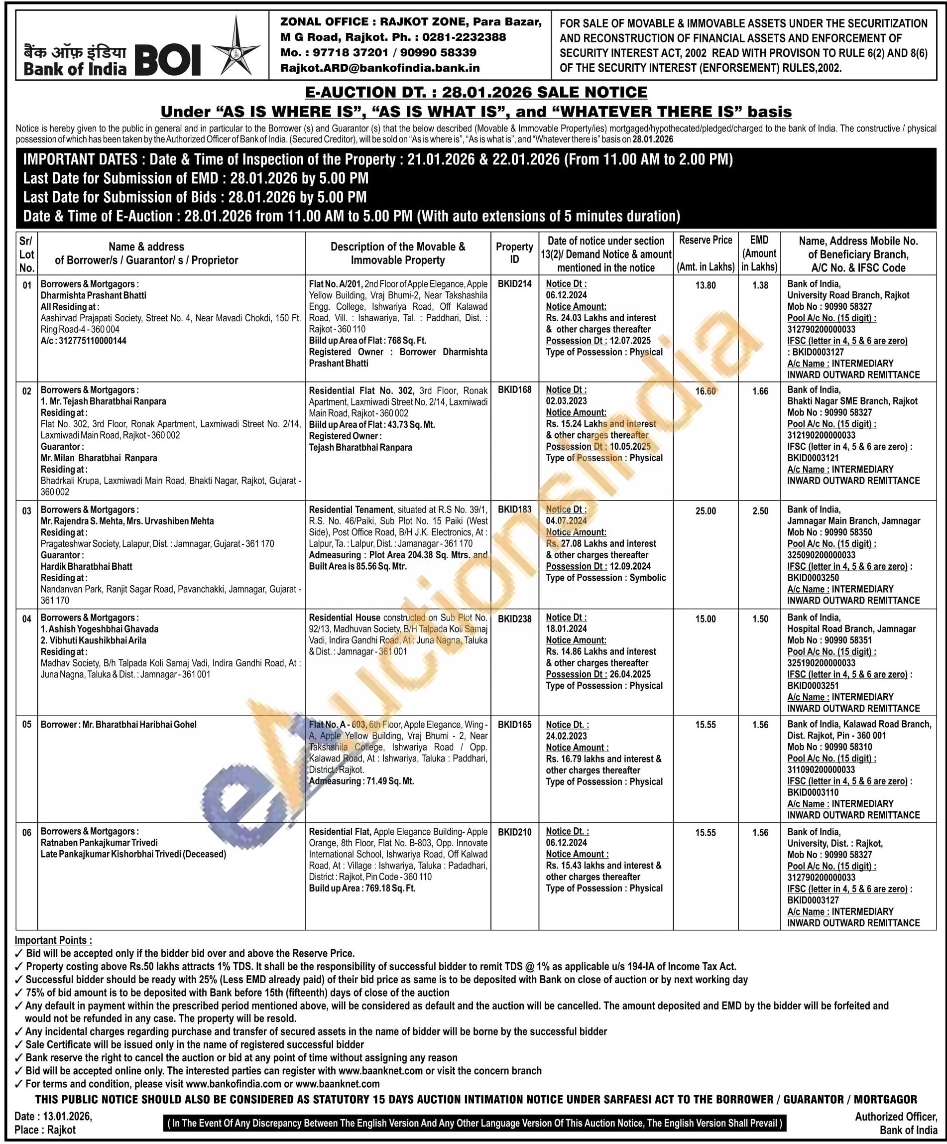 Residential Flat No. 302, 3rd Floor, Ronak Apartment, Laxmiwadi Street No. 2/14, Laxmiwadi Main Road, Rajkot-360002 Biild up Area of Flat: 43.73 Sq. Mt. Registered Owner: Tejash Bharatbhai Ranpara