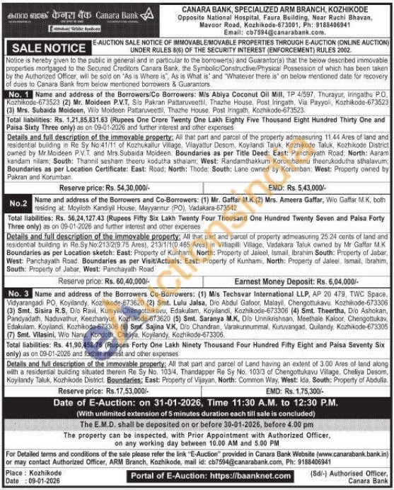 Details and full description of the immovable property: All that part and parcel of Land having an extent of 3.00 Ares of land along with a residential building situated therein Re Sy No. 103/4, Thandapper Re Sy No. 103/3 of Chengottukavu Village. Cheliya Desom. Koyilandy Taluk, Kozhikode District. Boundaries: East: Property of Vijayan, North: Common Way, West: Ida, South: Property of Abdulla