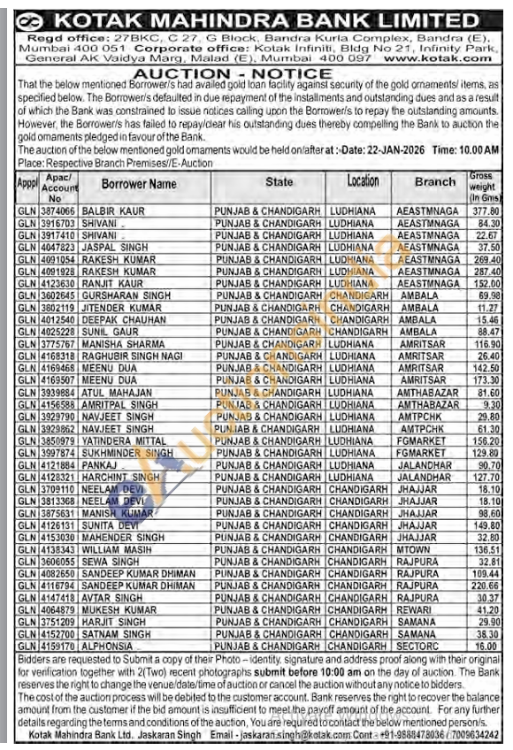Kotak Mahindra Bank Gold Auctions Auction in Chandigarh