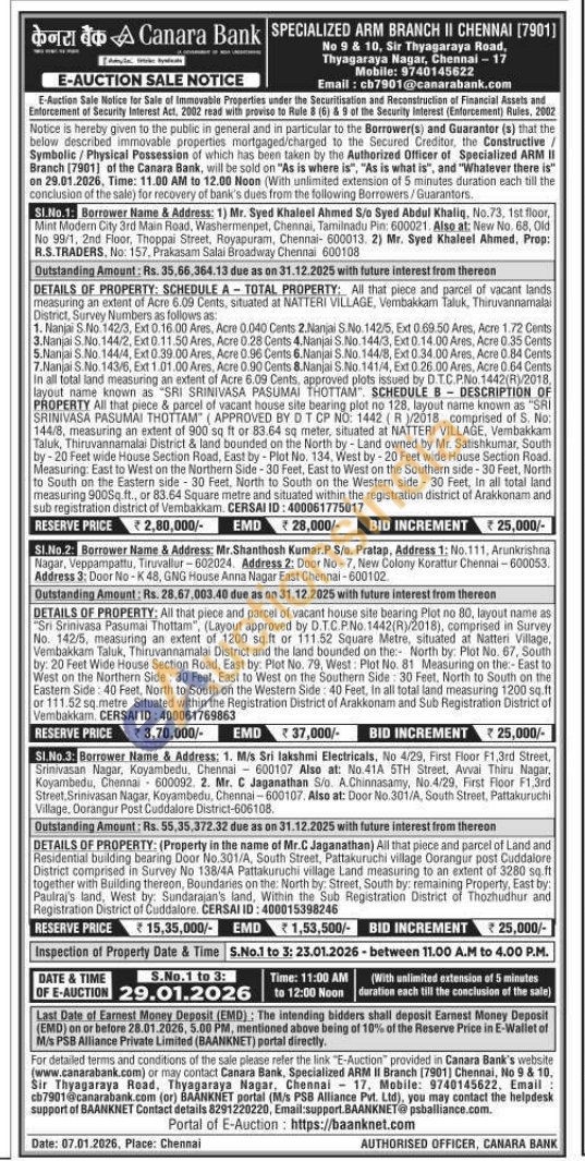 DETAILS OF PROPERTY: All that piece and parcel of vacant house site bearing Plot no 80, layout name as Sri Srinivasa Pasumai Thottam", (Layout approved by D.T.C.PNo. 1442(R)/2018), comprised in Survey No. 142/5, measuring an extent of 1200 sq.ft or 111.52 Square Metre, situated at Natteri Village, Vembakkam Taluk, Thiruvannamalai District and the land bounded on the North by Plot No. 67, South by: 20 Feet Wide House Section Road, East by: Plot No. 79, West: Plot No. 81 Measuring on the East to West on the Northern Side: 30 Feet, East to West on the Southern Side: 30 Feet, North to South on the Eastern Side: 40 Feet, North to South on the Western Side: 40 Feet, in all total land measuring 1200 sq.ft. or 111.52 sq.metre Situated within the Registration District of Arakkonam and Sub Registration District of Vembakkam. CERSAI ID: 400061769863
