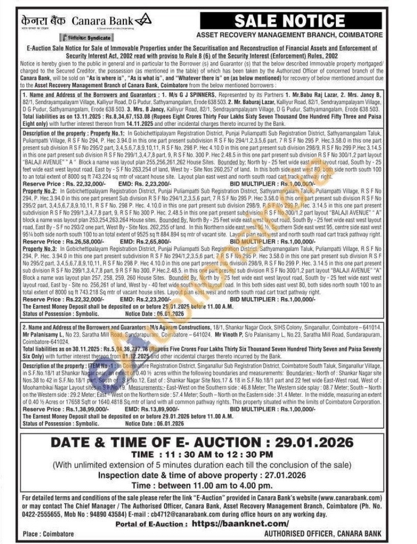 Description of the property: ITEM No-1: in Coimbatore Registration District, Singanallur Sub Registration District, Coimbatore South Taluk, Singanallur Village. in S.F.No. 18/1 at Shankar Nagar near, an extent of 0.40% acres within the following boundaries and measurements: Boundaries North of Shankar Nagar site Nos 38 to 42 in S.F.No.18/1 part, South of: S.F.No. 12. East of: Shankar Nagar Site Nos.17 & 18 in S.F.No.18/1 part and 22 feet wide East-West road, West of Moohambikai Nagar Layout sites in S.F.No.19. Measurements:- East-West on the Southern side: 46.8 Meter. The Western side splay: 08.7 Meter, South-North on the Western side: 29.2 Meter, East-West on the Northern side: 57.4 Meter, South-North on the Eastern side: 31.4 Meter. In the middle, measuring an extent of 0.401½ Acres or 17658 Sqft or 1640.4818 Sq.mtr of land with all common pathway rights. This property situated within the limits of Coimbatore Corporation