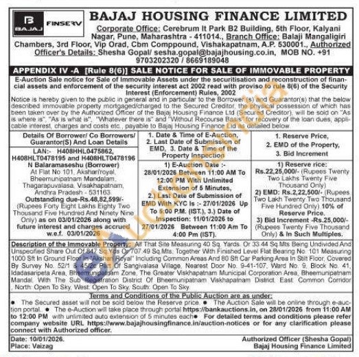 Description of the Immovable Property: All That Site Measuring 40 Sq. Yards. Or 33 44 Sq.Mts Being Undivided And Unspecfied Share Out Of 847 Sq. Yda Or 707.49 Sq. Mts. Together With Finished Level Flat Bearing No. 101 Measuring 1000 Sit In Ground Floor in "Akshari Royal" Including Common Areas And 80 St Car Parking Area In Stit Floor, Covered By Survey No. 52/1 & 45/2 Part Of Sangivalasa Village. Nearest Door No. 9-41-107, Ward No. 9 Block No 41, Idadasaripeta Area, Bheemunipatnam Zone, The Greater Viskhapatnam Municipal Corporation Arsa, Bheemunipatnam Mandat With The Sub Registration District Of Bheemunipatnam Viskhapatnam District East Common Corridor North Open To Sky. West. Open To Sky, South: Open. To Sky