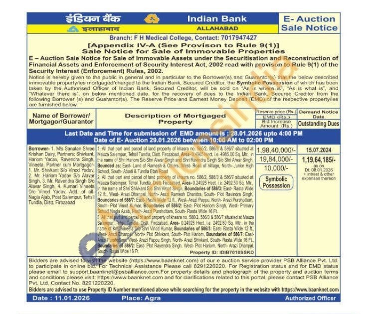 1. All that part and parcel of land property of khasra no. 586/2 586/3 & 586/7 situated at Mauza Salempur, Tehsil Tundia, Distt. Firozabad Area-0.4985 Hect. Le. 4965.00 Sq. Mr, in the name of Shin Hariom Sio Shin Alwar Singh and Shri Ravindra Singh Sio Shit Alwar Singh Bounded as: East- Land of Ramesh & Others, West-Road of Vilage, North Junior High School, South Abedi & Tunda Etah Road