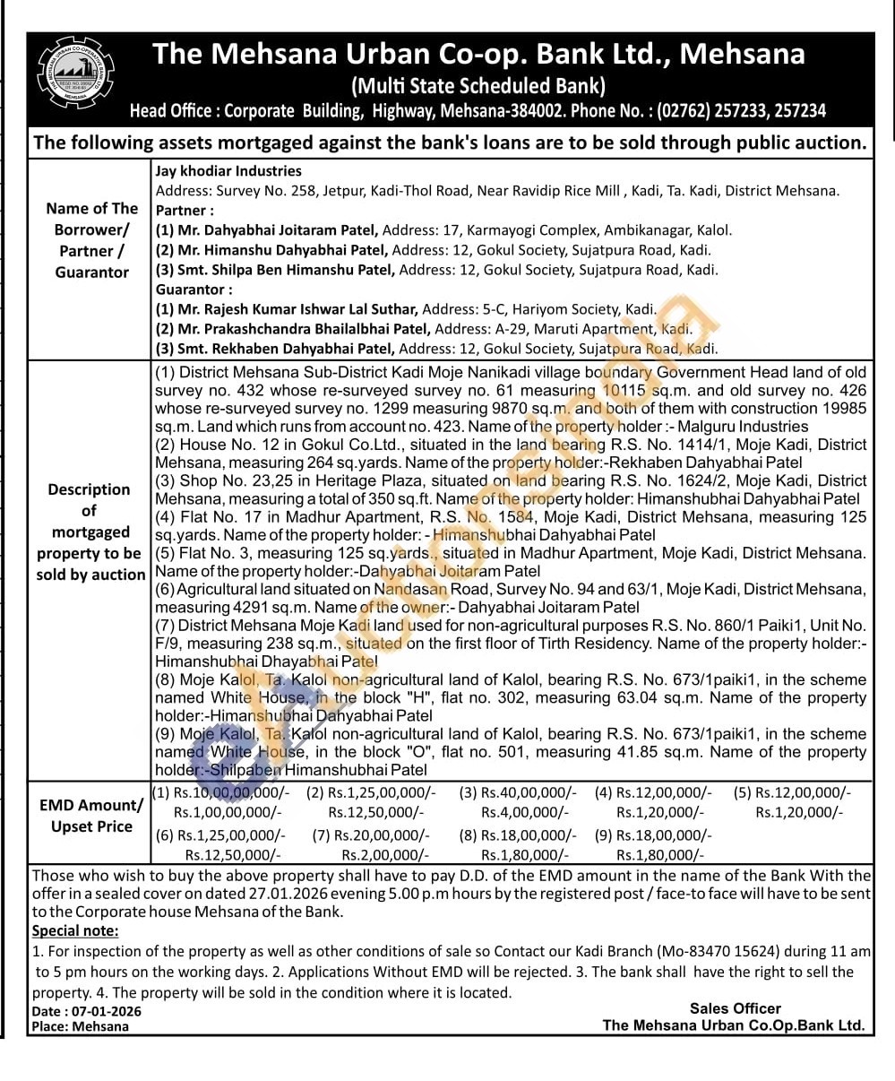 District Mehsana Sub-District Kadi Moje Nanikadi village boundary Government Head land of old survey no. 432 whose re-surveyed survey no. 61 measuring 10115 sq.m. and old survey no. 426 whose re-surveyed survey no. 1299 measuring 9870 sq.m. and both of them with construction 19985 sq.m. Land which runs from account no. 423. Name of the property holder:- Malguru Industries